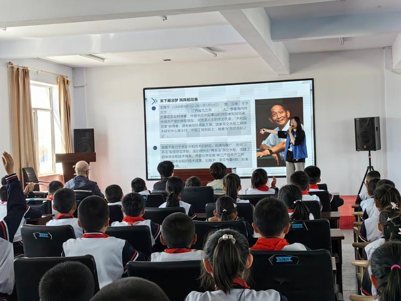 为弘扬学习习近平总书记给中国农业大学科技小院的同学们的回信精神,引导青少年学习袁隆平院士高贵品质和崇高风范,以实干实效继承袁隆平院士的遗志,5月22日,在袁隆平院士逝世两周年之际,pp电子游戏官网实践团联合我校港澳台学生前往珲春市哈达门乡中心学校开展宣讲活动,向学校学生宣讲袁隆平院士事迹、开展我国农耕文明知识讲座。