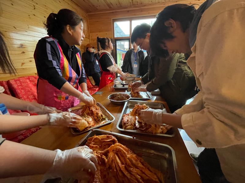 在珲春市哈达门乡一松亭村劳动教育基地,调研组一行在当地工作人员的指导下开展了一堂劳动技能课暨朝鲜族传统民俗教育活动——体验制作朝鲜族特色美食:泡菜、江米鸡。体验过程愉快轻松,师生学习体验了特色美食的制作过程,清洗、腌制、抹酱等一系列环节全部由师生共同协作完成。