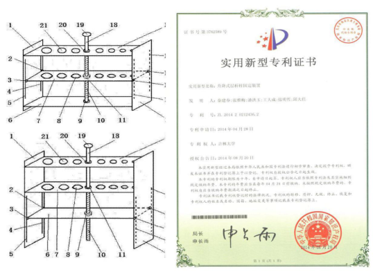 本成果为一种底座升降式层析柱固定装置+降式层析柱固定装置,底座板两端经四个滑轮与左右侧板上的四个滑槽滑动连接中、上孔径板中心分别与两个轴承的外圈固接,中、上孔径板上所设椭圆形孔和圆形孔均为一个,中孔径板上的椭圆形孔与上孔径板上的圆形孔,每对椭圆形孔和圆形孔的中心在一条垂直线上上孔径板、中孔径板两端分别与左侧板、右侧板的上、中部固接螺杆顶端固接手动调节轮,螺杆上、中部分别与两个轴承内圈固接,螺杆下部与固接于底座板中心的螺母螺纹连接本实用新型结构简单、易操作调节,接收瓶高度可随意改变,可解决层析柱固定后接收瓶高度不易改变的问