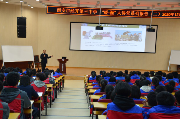 在短短的4天时间,在西安市经开三中“經•瀝”大讲堂经开三中常务副校长郑宏宝及400余名学生面前、在西安市第八十九中学报告厅教务处陈立鹏主任和高三文理科毕业班学生200余人面前、在西安中学招办吕铎和高三年级文理科实验班班主任面前、在西工大启迪中学会议室及多媒体教室王万斌校长等领导和120余名优秀学生面前,学院招生工作小组共进行了4场“筑梦起航在吉大”招生宣传专题演讲,此外,专家们分别作了题为“病毒与人类”、“车辆系统动力学仿真分析研究”科普讲座。同时,分别向除西安中学外的其他三所中学授予“pp电子游戏官网优生源基地”牌匾。