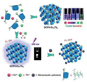 为解决上述问题,杨英威教授、韩俊友教授、秦建春教授联合团队利用一种含双羧基的柱[5]芳烃(DCP5)作为配体,利用铕离子(Eu3+)及铽离子(Tb3+)作为中心配位离子,构建了一种新型的荧光颜色可调的柱芳烃配位聚合物(PCP)DCP5-EuxTby,有趣的是当调节加入的Eu3+:Tb3+摩尔浓度比为1:3时,可得到白色荧光发射的DCP5-Eu1Tb3,这种新型传感器可有效检测动物及植物体内的硝基芳香污染物。