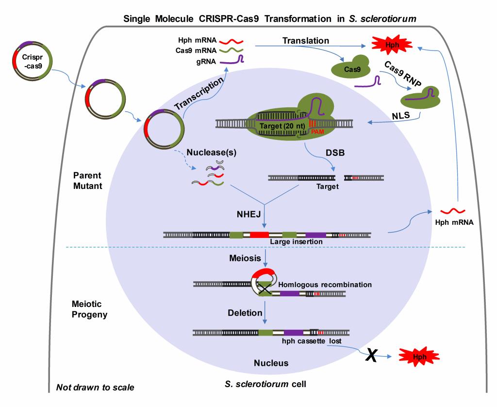 核盘菌(S.sclerotiorum)是引起作物菌核病的一种重要的植物病原真菌。其寄主范围极广,病害易流行。pp电子游戏官网潘洪玉教授带领的“作物重大病害流行预警及其绿色综合防控关键技术研究”吉林省重大科技研发人才团队,多年来致力于核盘菌致病和发育分子机理的研究。然而,基于传统的基因突变技术(同源重组、基因沉默、T-DNA插入及UV诱变)存在效率低、不稳定等问题,制约了核盘菌致病基因功能的研究,因此,急需开发新的、高效、经济及简便的基因突变技术。CRISPR技术是在上个世纪九十年代初发现的并在近几年迅速成为人类生物学、农业和微生物学等领域最流行的基因编辑工具。该论文报道了核盘菌CRISPR-Cas9介导的基因编辑策略及该技术在核盘菌未知基因功能领域的应用。该研究发现将编码Cas9、靶标sgRNA和标记基因的质粒转化到核盘菌中后,可对靶标基因造成高频率的插入突变。研究发现核盘菌在Cas9蛋白造成靶基因双链断裂(DSB)后,并在非同源末端修复(NHEJ)机制下将降解的质粒片段随机组合并整合到DSB位点,造成大片段插入的靶基因突变。因此,筛选标记(HygB)的辅助下,即可以获得含HygB抗性的插入突变体。该研究还发现,随机整合的大片段在同源序列存在的情况下,经核盘菌有性生殖阶段会因同源重组而发生片段丢失,因此又可以在子囊孢子中筛选到HygB抗性丢失的子代突变体。该编辑体系模型在三个独立的核盘菌野生型上进行了验证,并实现了对草酸相关基因(SsOah1)及黑色素相关基因(SsPks13)进行了高效突变。该研究结果不仅进一步确定了草酸在核盘菌致病上的关键作用,还发现了其对菌核和侵染垫的数量也有重要影响;同时发现侵染垫的色素积累对核盘菌的侵染及致病性无显著影响。CRISPR-Cas9技术在核盘菌中的开发和运用将进一步推动核盘菌后基因组时代,也会加速核盘菌致病相关基因的挖掘与功能研究,对于快速鉴定核盘菌新的致病因子及最终实现病害防治具有重要意义。