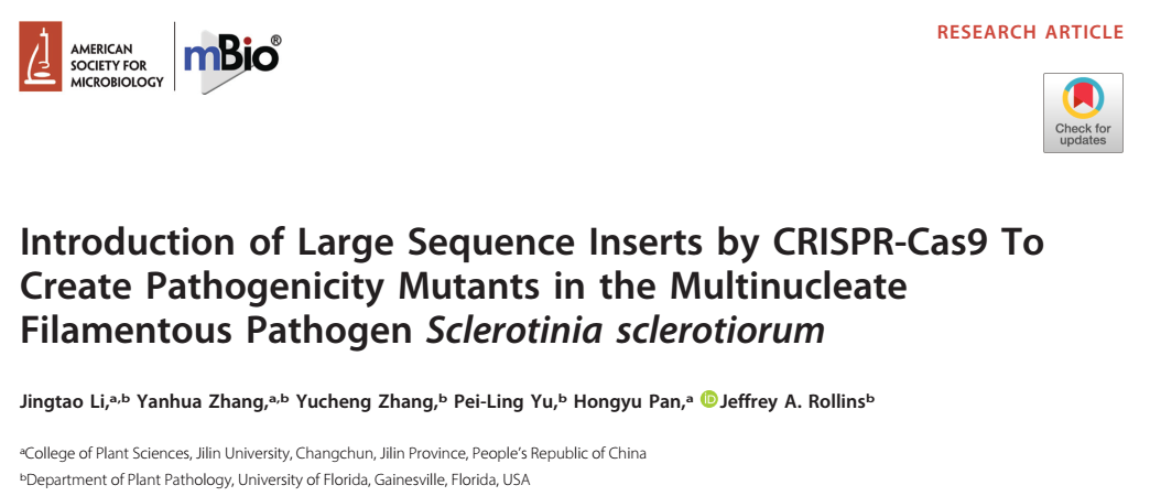 2018年6月26日,pp电子游戏官网潘洪玉教授领衔的创新团队与美国佛罗里达大学Prof. Jeffrey A. Rollins在美国微生物学会(American Society for Microbiology)旗舰下最重要学术刊物《mBio》(IF=6.956)在线发表了死体营养型植物病原真菌-核盘菌(Sclerotinia sclerotiorum)基因编辑领域的重要原创成果“Introduction of large sequence inserts by CRISPR-Cas9 creates pathogenicity mutants in the multinucleate filamentous pathogen Sclerotinia sclerotiorum”(doi:10.1128/mBio.00567-18)。该文章以pp电子游戏官网为第一完成单位,首次报道了核盘菌CRISPR-Cas9基因编辑机理并对草酸合成关键基因SsOah1、侵染垫形成与色素积累相关基因SsPks13进行编辑,阐明了其对核盘菌致病及生长发育的影响。核盘菌基因编辑技术对其他作物丝状病原真菌基因功能研究亦具有重要科学价值。该项研究由张艳华教授和李敬涛博士共同完成,pp电子游戏官网潘洪玉教授与佛罗里达大学Jeffrey A. Rollins为共同通讯作者。
