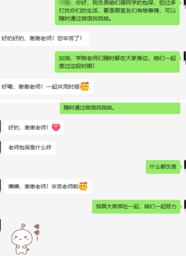 班主任胡兰娟的包保对象中,有居住在校区2号公寓的95名女生,针对不同女学生的特点,胡兰娟将她们划分成不同的“组”,分别采取“观察动向”“集体交流”“单独交心”等方式与学生深度沟通,取得较好效果。班主任王军注重以视频、案例等与学生进行交流,并及时在微信群发布学校防控政策与要求、居家抗疫常识、学术讲座、心理健康小贴士等信息。班主任吴涛在包保工作中积极回应学生关切,通过主动沟通、联络,帮助2名学生解决了资料打印、实验室设备检查等问题。