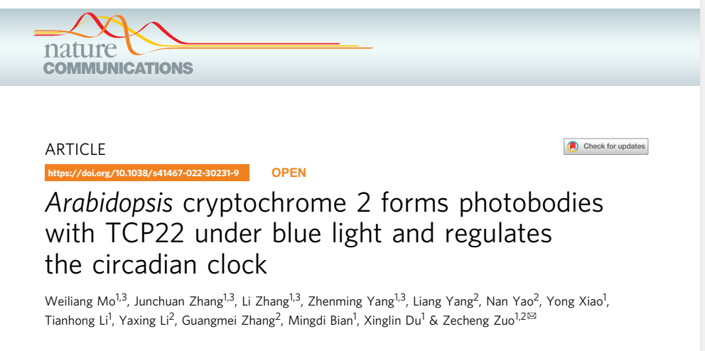 2022年5月12日,pp电子游戏官网杨振明团队的左泽乘课题组在Nature Communications杂志上发表题为“Arabidopsis cryptochrome 2 forms photobodies with TCP22 under blue light and regulates the circadian clock”的研究论文,该研究首次解析了蓝光受体CRY2(Cryptochrome 2)在蓝光下调控生物钟的分子机制。