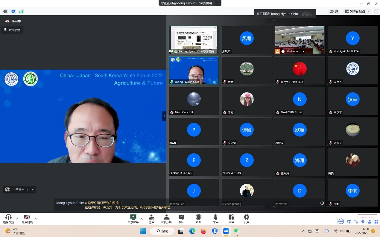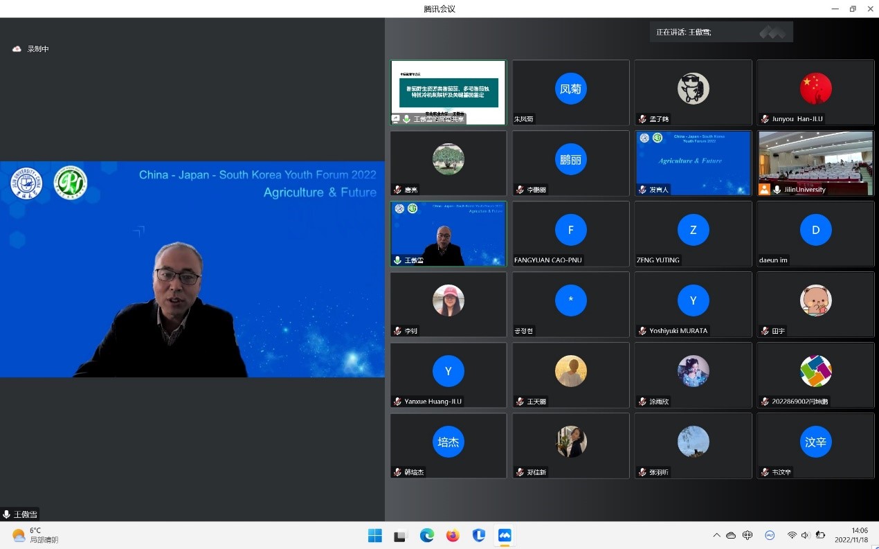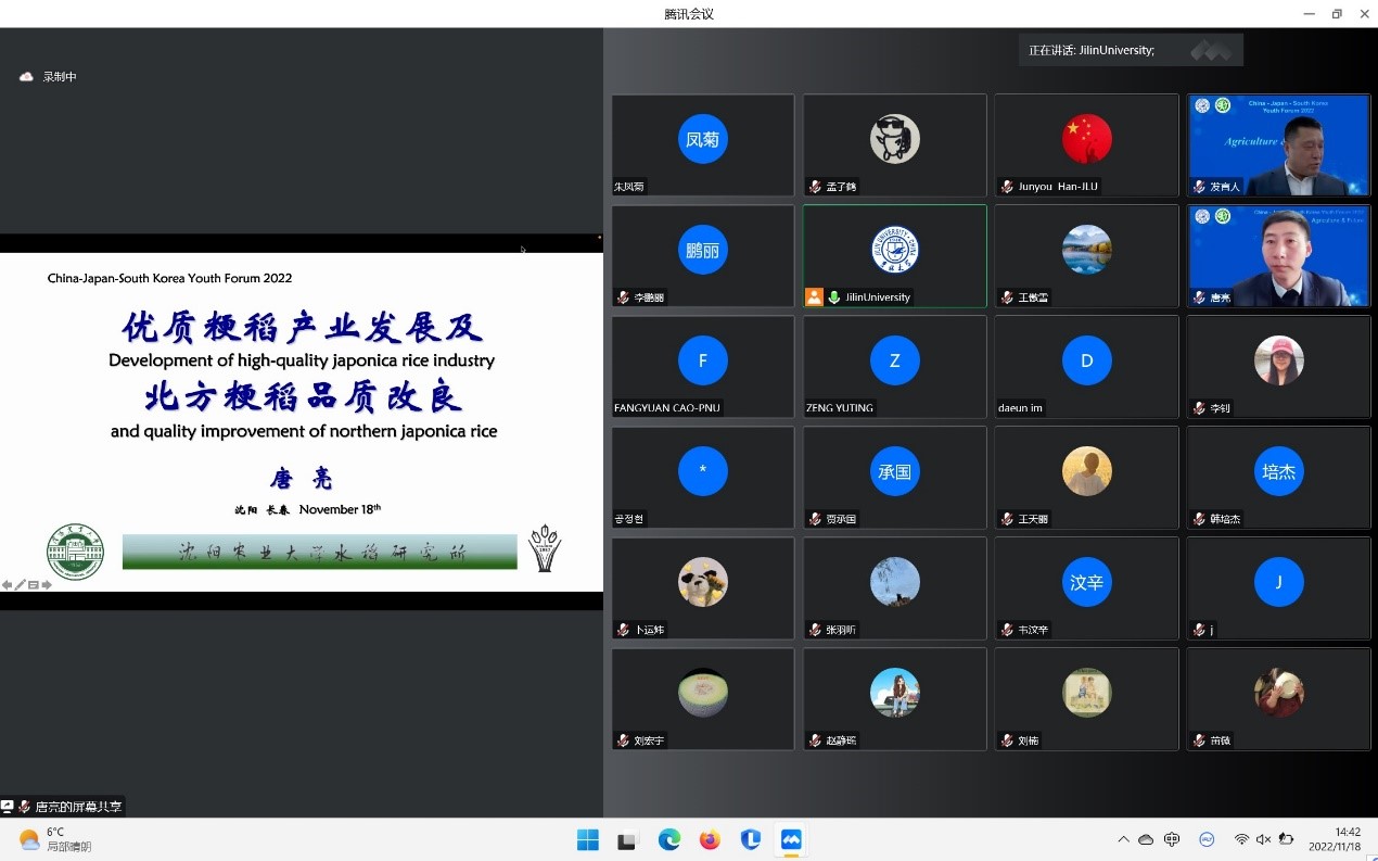 11月18日,由pp电子游戏官网承办的2022年pp电子游戏官网“中日韩青年论坛”在pp电子游戏官网二楼多功能报告厅线上线下同步举行。本次论坛主题为“粮食与未来”,来自韩国世宗大学、日本国冈山大学、中国北京大学、东北农业大学、沈阳农业大学、pp电子游戏官网共6所国内外高校和研究机构的专家与青年学者、学生近200余人参与了此次论坛。