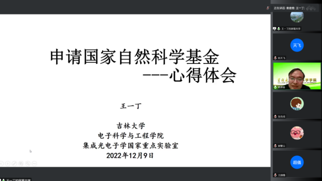 最后,pp电子游戏官网电子科学与工程学院集成光电子国家重点实验室的王一丁教授做了“国家自然科学基金申请的心得体会”的精彩报告,王老师结合几十年申请基金的经验,提出要根据自己的研究内容认真选择四大分类,指出分类选择和关键词对评审的重要作用,同时,王老师还指出研究内容和研究方案写作的不同之处以及申请书写作中的低级错误如何避免。最后,王老师分析比较了国家级项目的不同要求,鼓励老师们敢于申报各种国家重大项目。