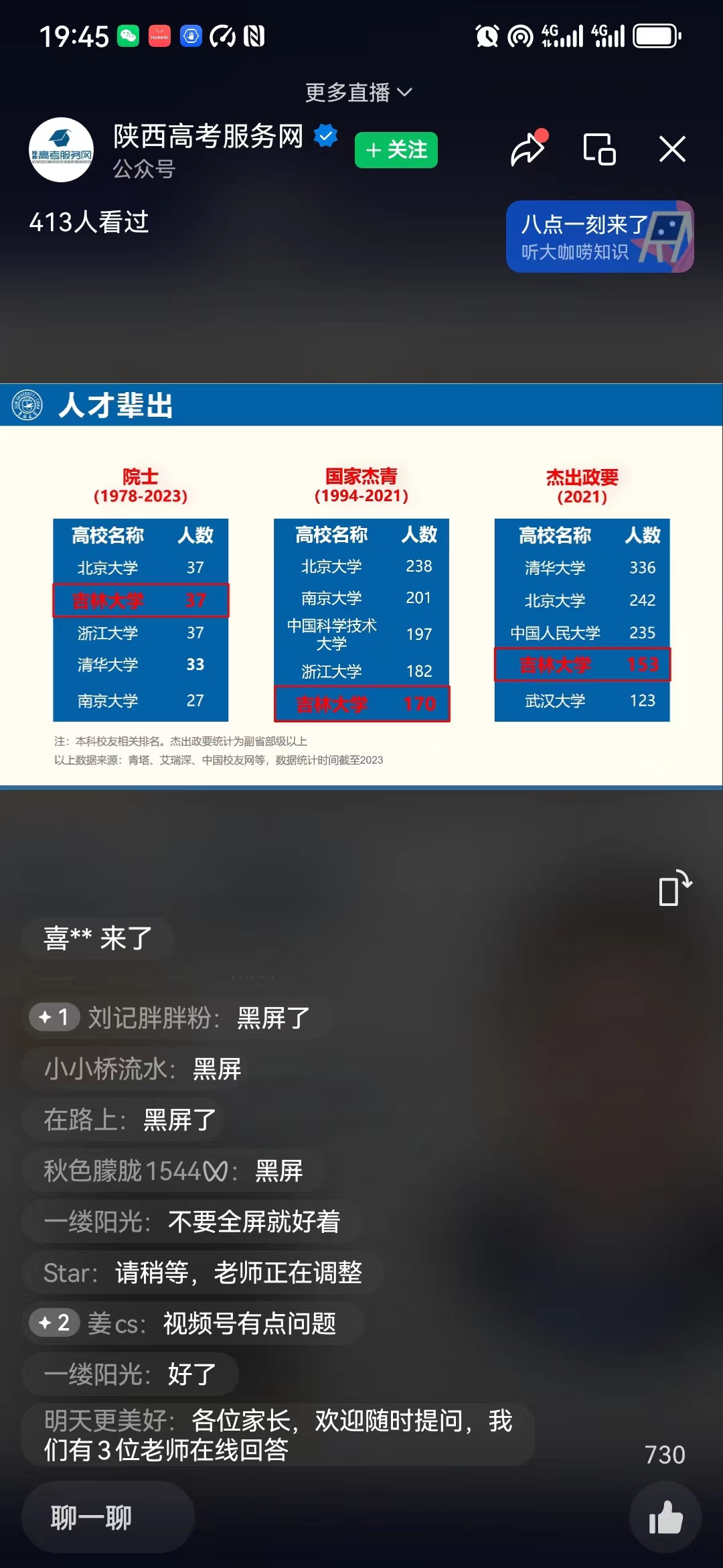本次招生宣讲主要是面向2024届高三学生家长,从宣讲报告会开始,收看的人数持续增加,人数最多的时候达到800余人。