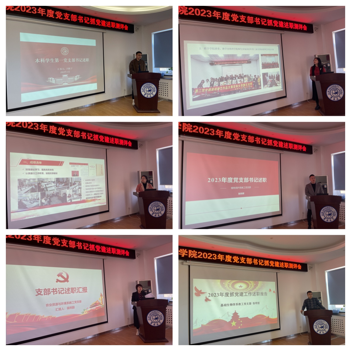 会前,学院全部14个党支部书记严格按照《关于开展2023年度全校各级党组织书记抓基层党建工作述职评议考核的通知》文件要求,重点围绕“六个方面”,总结回顾过去一年的工作,分享成绩和经验,查摆剖析存在的问题和原因,并就结合“强农兴农行动”计划支部如何找准发力点展开深入思考,撰写述职材料。