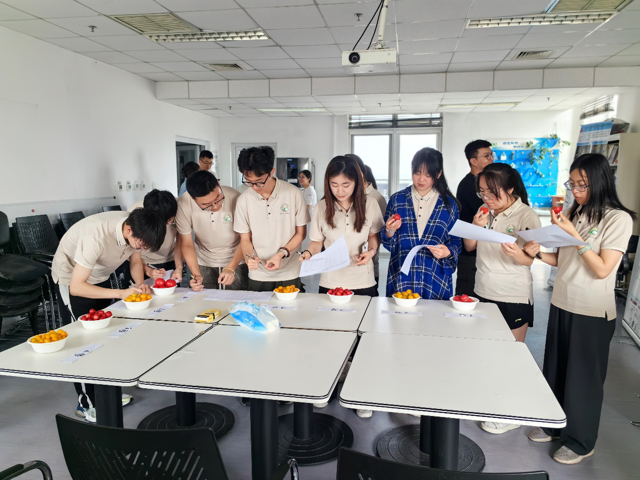 在许操番茄研究组,研学师生听取了番茄快速驯化,构建结构性雄性不育和人工智能授粉等成果,之后进行了番茄品鉴活动,对大小颜色各异的番茄酸甜度,化渣性等多方面评分。最后来到番茄温室与番茄育种加速器进行参观。