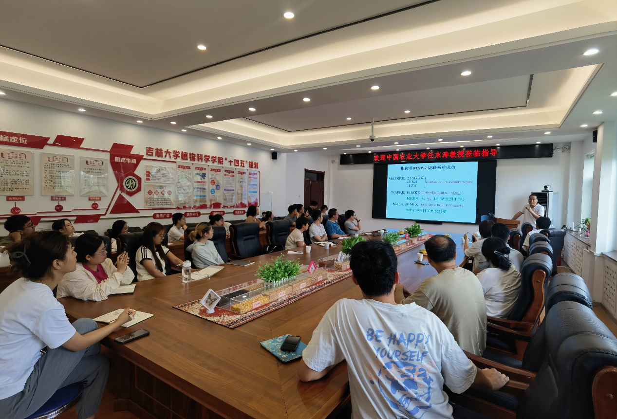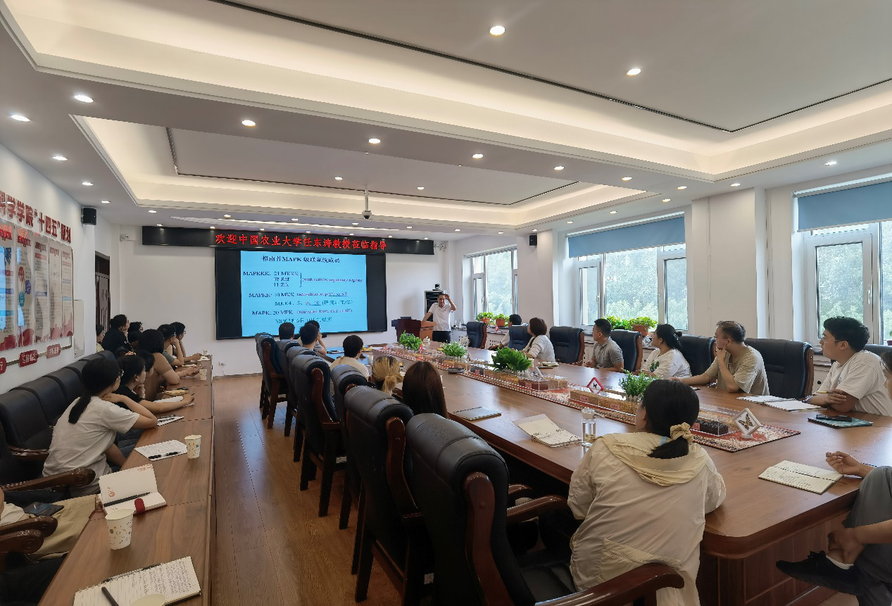 任东涛教授长期从事植物蛋白质磷酸化及植物逆境响应的信号转导机制研究。此次报告紧紧围绕植物蛋白质磷酸化的一系列科学问题,从最基础的相关概念入手,详细讲解蛋白质磷酸化的功能、激酶的活性分析、磷酸化蛋白的鉴定、磷酸化位点的分析、蛋白质磷酸化的模拟等,并以拟南芥和玉米为例,重点介绍了MAPK级联与植物胁迫间的相应调控机制,通过巧妙地试验设计及试验工具创制,不断攻破科学难题。报告现场的学术交流环节异常热烈,我院教师及学生就各自科研上遇到的相关问题与任东涛教授进行了深入的交流并获得了宝贵的建议。
