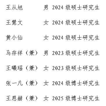 根据《pp电子游戏官网研究生会章程》《pp电子游戏官网学生工作兼职人员培养计划实施方案》等相关文件要求,经学生本人申报、资格审查、面试考察等环节,拟聘王从旭等7名同学为pp电子游戏官网第十六届研究生会主席团成员,具体名单如下: