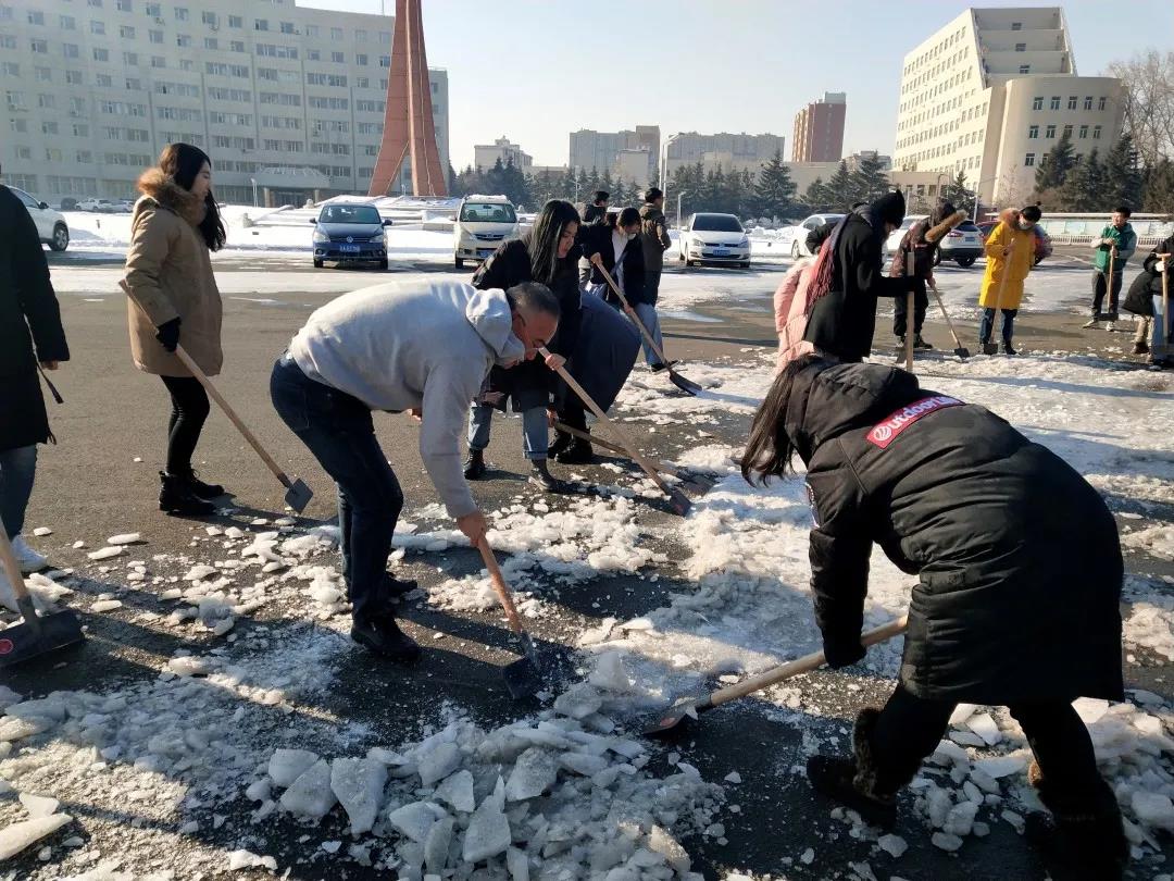 在凛冽的寒风中,党员和积极分子们不惧严寒,挥舞着手中的铲子和铁锹,开始了辛勤的劳动。他们先用锋利的铲子将厚达4、5厘米的坚冰一点点地敲碎,再用铁锹和扫帚等工具将碎冰清理干净。在这个寒冷的冬日,他们互相配合,一同劳动的身影为每一个人的内心都带去了温暖,也为我们的校园增添了一份温情。