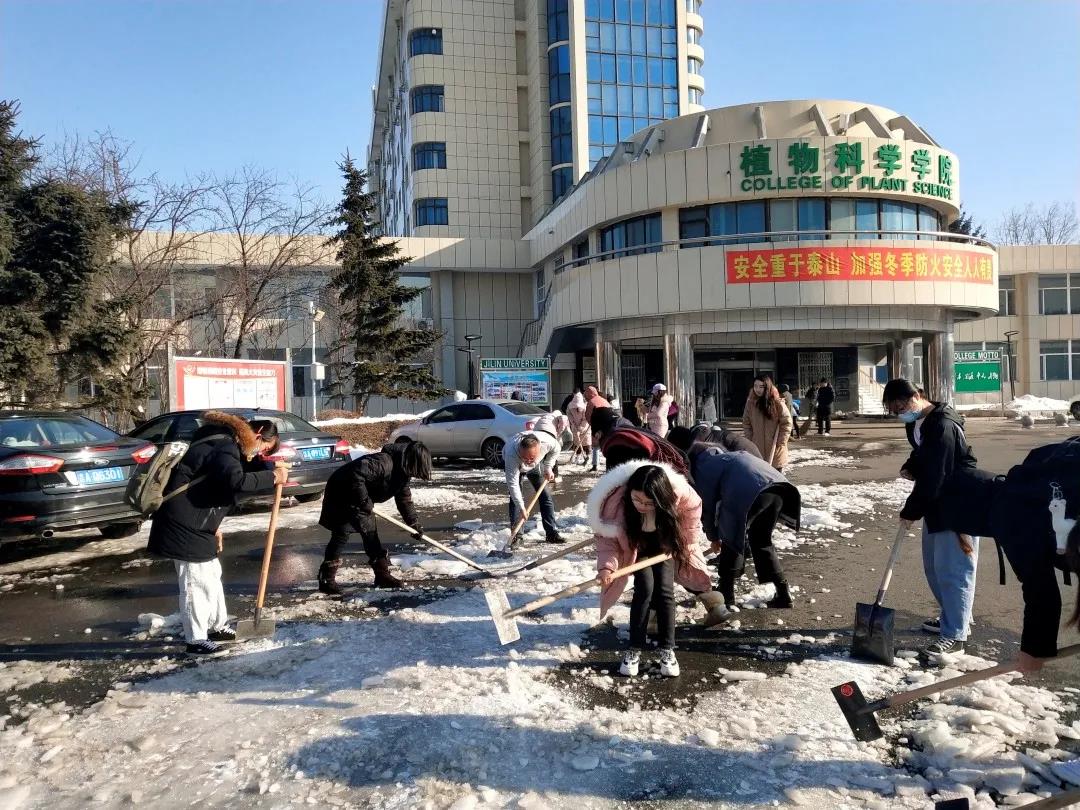 2020年11月19日,长春迎来了一场几十年未见的大雪。前一夜的冻雨挂在路边树木的枝条上,被大自然雕刻成美丽而又沉重的冰棱。鹅毛般的雪花从天上片片飘落,包裹住了整片大地,银装素裹的美丽景象赶走了冬日的肃杀与萧瑟,为校园添加了一丝俏皮的气息。但大雪在带给同学们美丽景象的同时,路上的积雪反复融化后形成厚实的冰层也为大家的出行安全带来了很大的隐患。pp电子游戏官网本科学生党支部的全体党员和部分积极分子拿起了除冰扫雪工具,展开了此次活动。