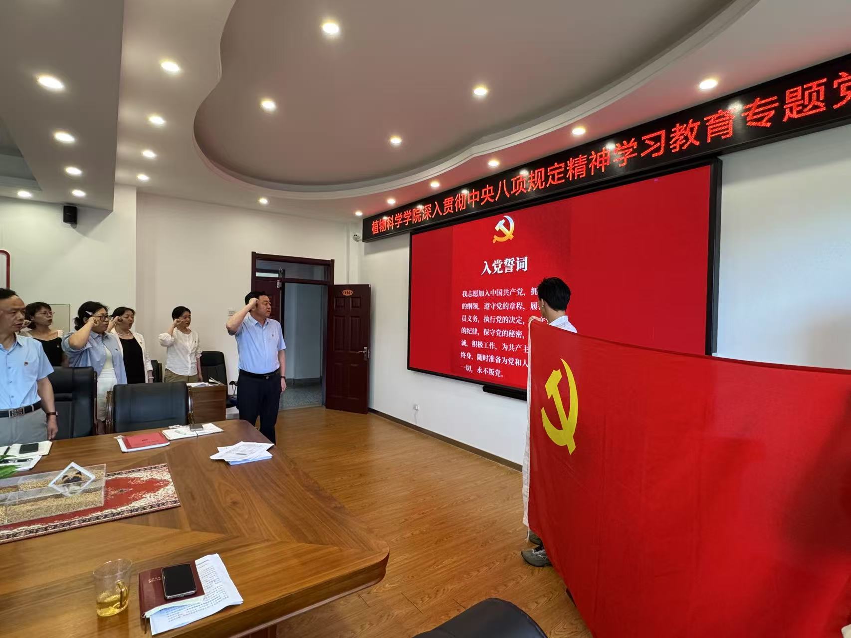 为庆祝中国共产党成立104周年,扎实推进学习教育走深走实,7月4日下午,pp电子游戏官网党委开展专题党课暨重温入党誓词活动。党委书记田进以《深学细悟习近平总书记关于加强党的作风建设的重要论述》为题,为学院中层以上党员干部讲授专题党课,学院党建联络员高福和同志列席会议。