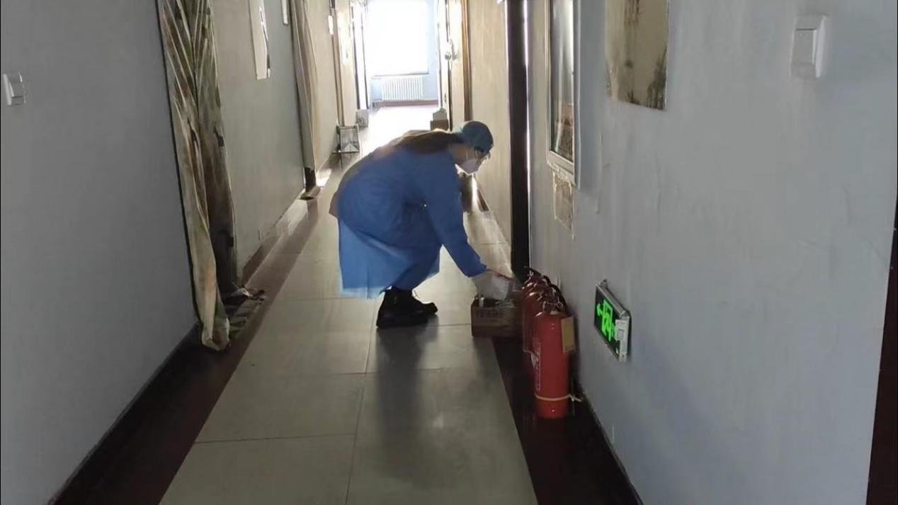 每天6点30分,志愿者们换上蓝色的防护服,戴好帽子、口罩、护目镜等防护装备,准备就绪后开始为大家发放早饭和晨间抗原自测试剂盒。“同学,早饭和试剂盒在门口了,记得9点前将结果汇报在群里”,就这样志愿服务的一天开始了。9点,四名志愿者将本楼层的抗原检测结果进行复查并报告给楼长老师。10点20分,四名志愿者开始为大家发放一天的饮用水。11点10分,发放午饭的时间到了,四名志愿者发午饭的同时还要提醒大家及时查阅群里消息,别错过了下午的核酸检测。14点20分,“同学,要去做核酸检测了”、“戴好口罩”、“保持安全距离”……随着这几声提醒,核酸检测结束。17点15分,“同学,晚饭和试剂盒在门口了,记得晚上8点前将结果汇报在群里”。20点,“老师,二楼18人检测,18人阴性,0人无效,0人异常”,“三楼……”,“四楼……”……就这样,志愿者们完成了一天的志愿服务。