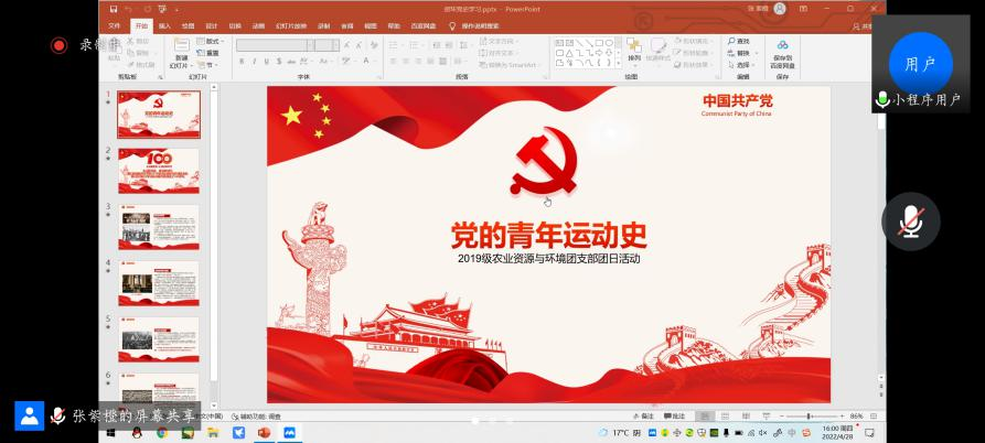 建团100周年之际,为积极宣扬五四精神,引导广大团员青年继承五四运动的光荣传统,pp电子游戏官网2019级农业资源与环境专业团支部于5月4日线上召开了“青春心向党,建功新时代”主题团日活动。
