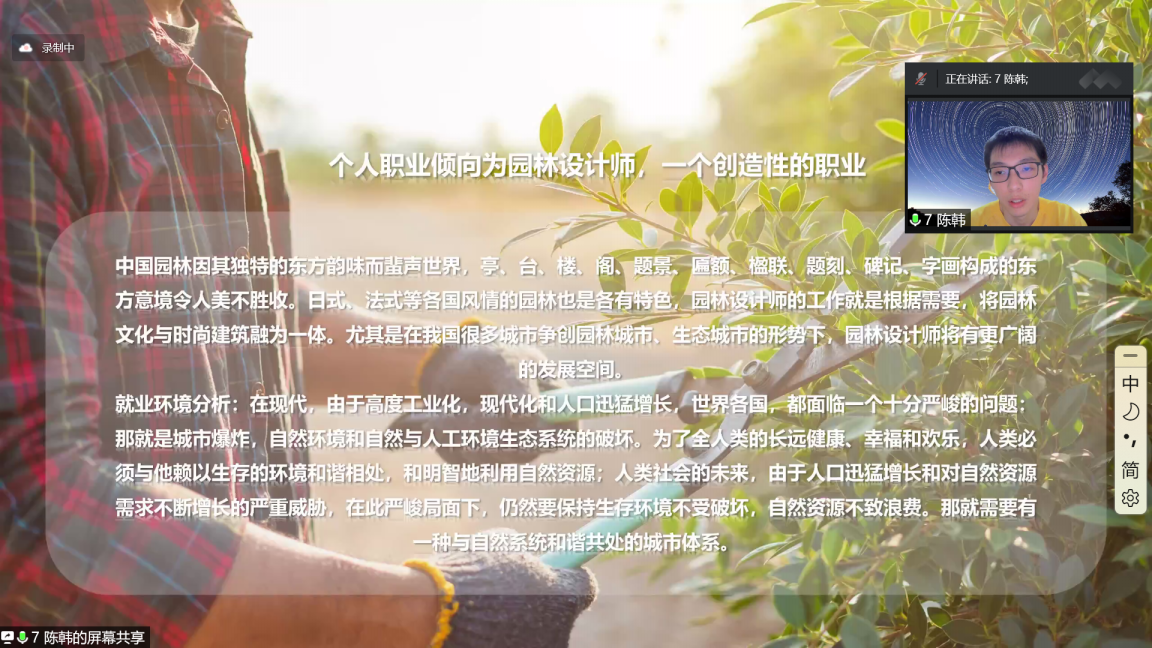 本次职业生涯规划大赛共有7支队伍参加,以小组PPT汇报的形式,为大家呈现了一场精彩纷呈的比赛,各个参赛队伍从不同的角度、以不同方式对职业规划做了深入的分析与阐释。“豪哥说的都队”(成员:段松彤、张文豪、刘智瑞)结合本专业植物科学与中国农学发展需求,将自身职业目标分成四个阶段并做了清晰的规划;“对对队”(成员:玄澄超、樊伊凡、木尼热)从四个名人的职业规划故事切入作为切入点,与同学们分享小组成员的职业规划;“快乐大本营队”(成员:张乃元、李致霖、苏鑫悦)采用三人接力的形式进行小组汇报,结合MBTI、霍兰德职业兴趣自测与SWOT分析等职业规划专业术语,为大家讲解了职业发展方向;“英语C语言大物线代化学近纲全都队”(成员:胡若琳、乐璇、李坤桥),三人从环境分析、职业定位与计划执行三个方面完成了一份完整的职业规划;“尹文队”(成员:朱凤菊、王鑫圣、宋明洋)从实际出发,通过三个问题——是什么、为什么、怎么做,将大家引入职业规划话题中;“我竟无言以队”(成员:张梓昂、柏世娇、许煜纬)以“以梦为马,不负韶华”为主题,提醒同学们应有担当时代的责任;“通辽日报社队”(成员:陈韩、高英开、陈世龙)汇报内容别出心裁,陈韩同学为大家展示了个人的职业计划——园林设计师,多角度为自己的理想职业做规划。