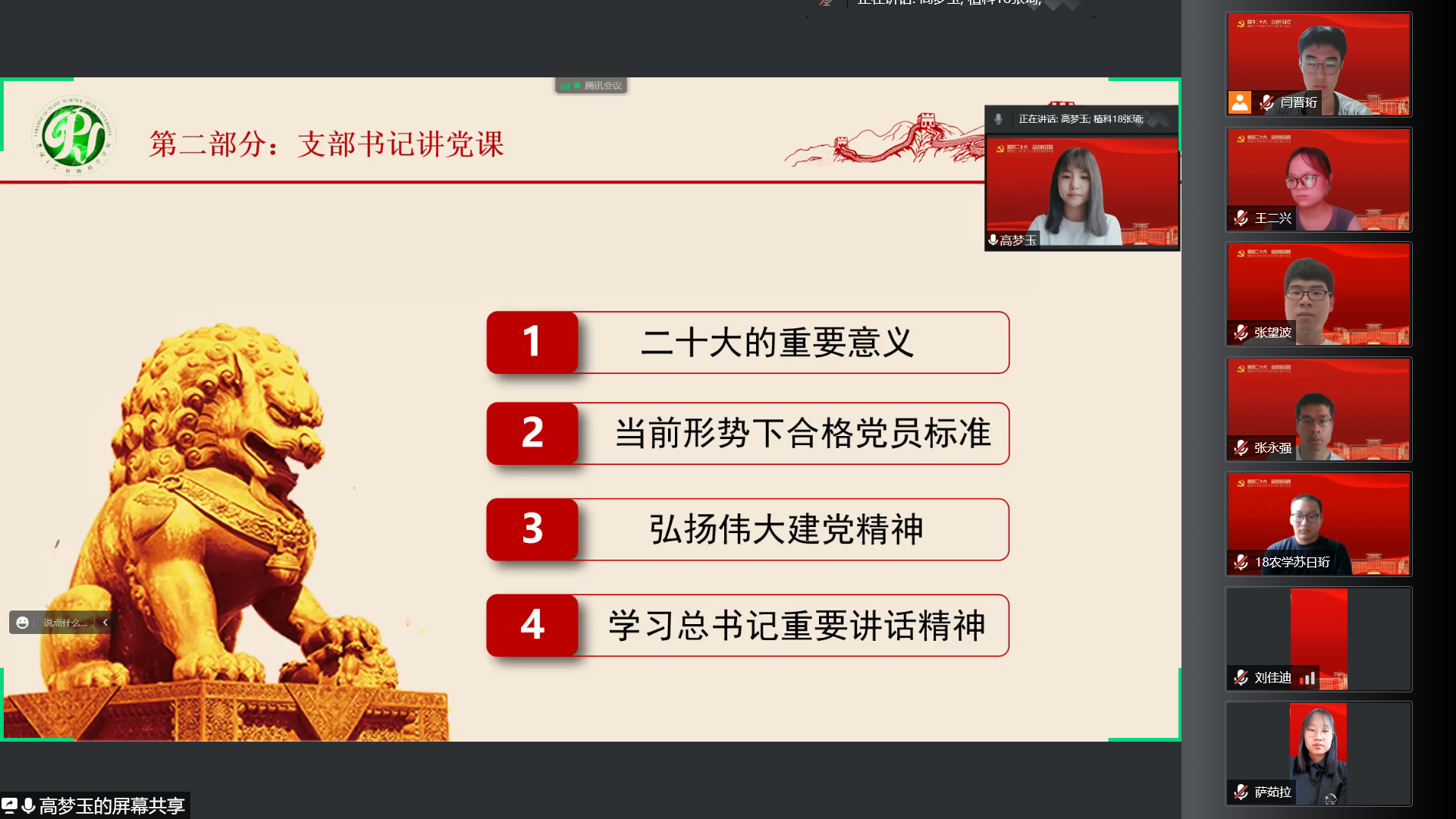 会议第三项,支部书记讲党课。通过强调二十大的重要意义、明确当前形势下合格党员标准、弘扬伟大建党精神、学习总书记重要讲话精神,与会同志学习心系“国家事”、肩扛“国家责”,坚定文化自信,以报效国家、服务人民为自觉追求。