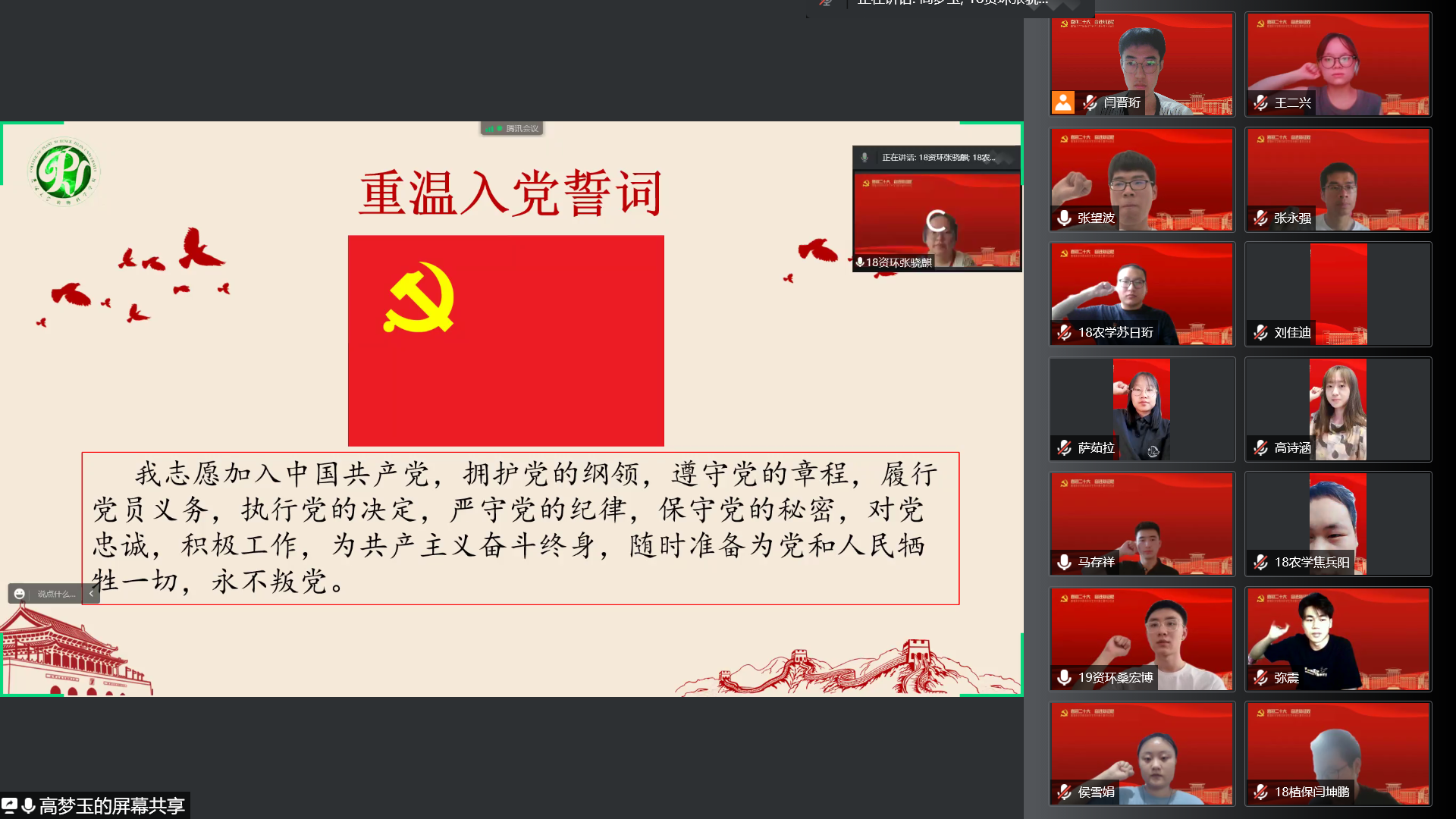 会议第二项,重温入党誓词。本科学生第一党支部书记高梦玉同志带领与会党员重温入党誓词,端正入党动机,明确党员职责,不忘初心、开拓进取,为共产主义奋斗终身。