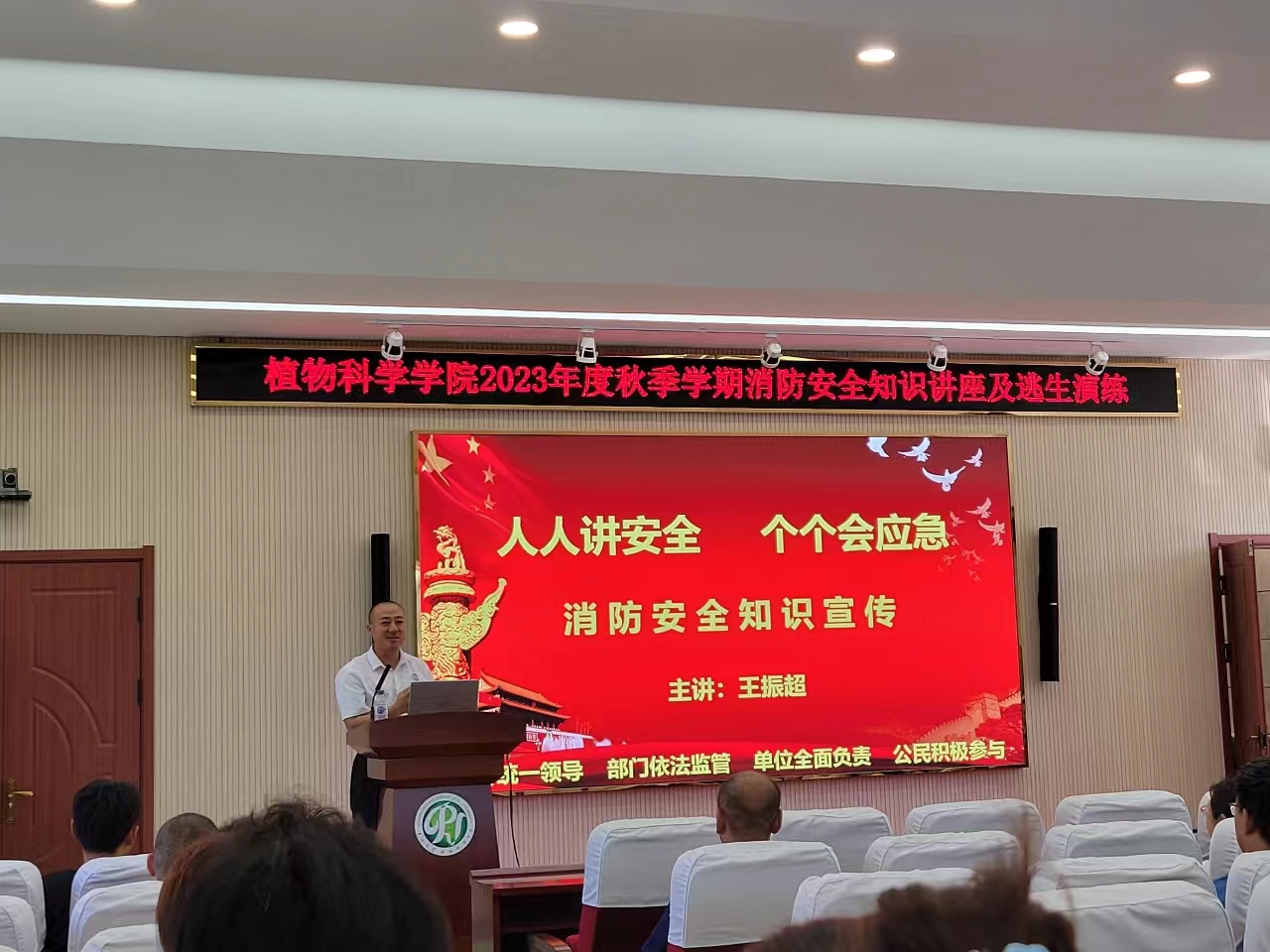 根据学校年度综治消防安全工作要求,依据学院秋季学期工作计划安排,进一步加强学生的消防安全知识,提高师生的安全意识和自救自护能力,切实保障师生在突发事件来临时的生命安全。2023年9月15日13:30,pp电子游戏官网在植科楼二楼报告厅举行2023年度秋季学期研究生消防安全知识讲座及模拟实景现场逃生演练活动。由pp电子游戏官网党委书记于生宗、综合办主任吴成锋、研究生辅导员邓松和保卫处相关老师组织带领全体教职工和全体研究生参加。