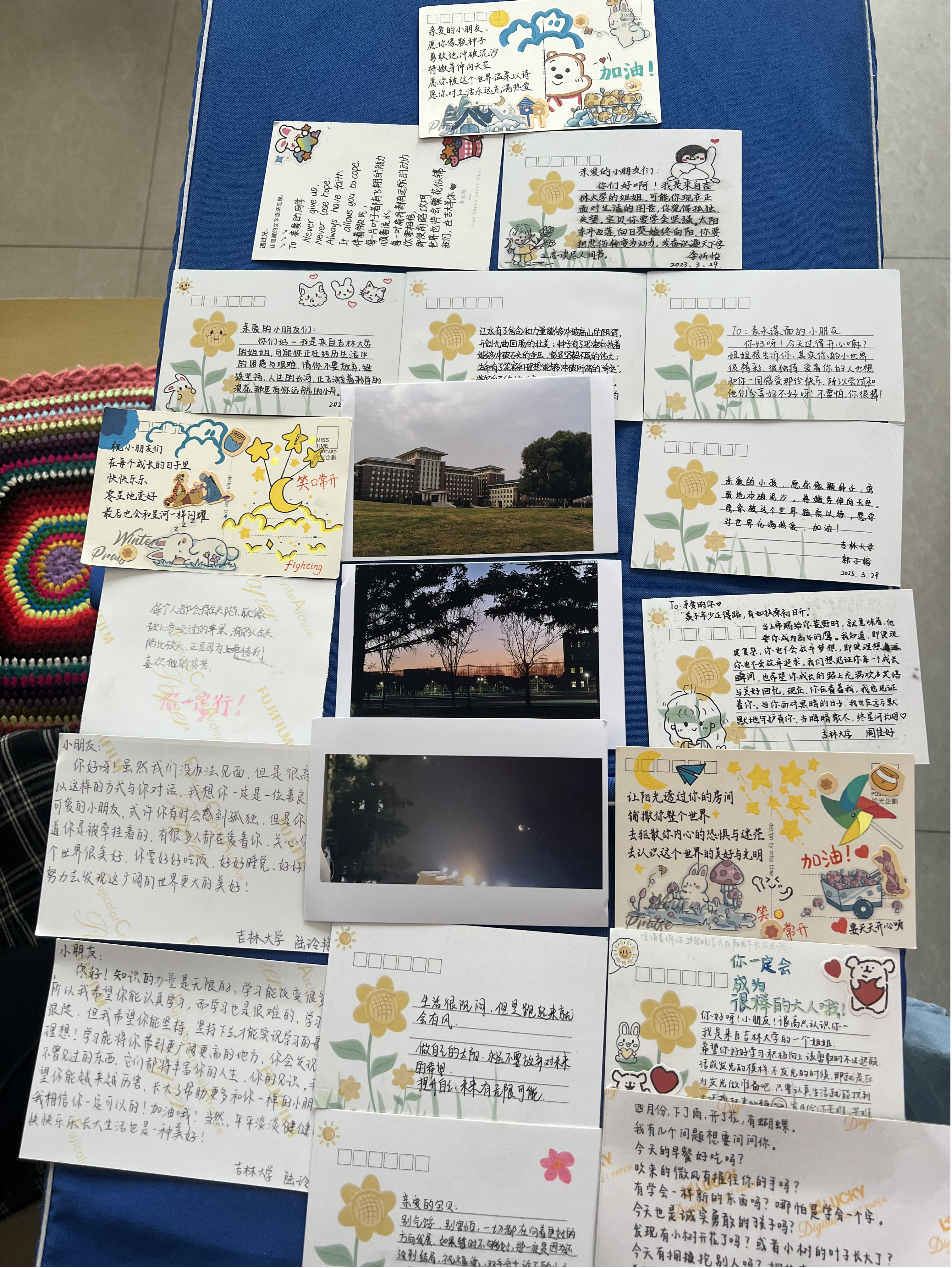 他们收到了我们送给他们的摄影作品、明信片和爱心物资,我们也收到了来自他们的回复。一张张明信片充满了我们对他们的鼓励与支持,一幅幅摄影作品承载了我们对他们的关心和希望。收到礼物的他们也感受到了来自我们的温暖,对我们的奉献,表达了感谢。文字是有力量的,图片是有灵魂的,而与素昧平生但渴望陪伴与温暖的灵魂建立一种联结,是治愈而温暖的……通过这种最原始的邮寄方式,怀揣着真诚跨越千里,与他们保持着独特的联系让他们感受到生活的美好与人世间的温暖。各位Jluer们,吉人行天下,暖意沁童心,感谢同学们参加我们这次公益活动!